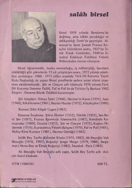 ''Yeryüzünün belli başlı mitolojik kentlerinden biri İstanbul, kentin şahdamarı Beyoğlu. Her yiğidin harcı değil böyle zorlu bir konuyu kuşatmak. Salâh Birsel'in boşuna en ünlü kitabı olmamıştır: Ah Beyoğlu Vah Beyoğlu, yayımlandığı 1976 yılından bu yana, edebiyatımızın kült kitaplarından biri sayılagelmişse, bunun en somut nedeni bir benzerinin kaleme alınamamış olmasından geliyor. Ah Beyoğlu Vah Beyoğlu, yalnızca bir semtin, bir caddenin panoramik tarihi olarak sınırlanamaz: Aynı zamanda bir dönemin çokrenkli tanığıdır. Daha da önemlisi: Türk Edebiyatı'nın en keyifli yazılarından biri.''