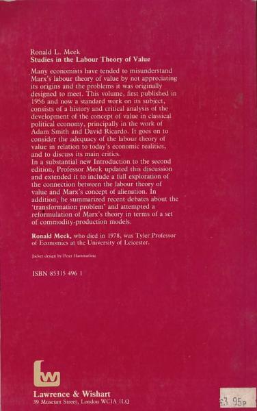 A. W. Coats reviewed Studies in the Labour Theory of Value positively in Kyklos, writing that whether or not Meek was successful in his defense of the labor theory of value, he "certainly provided enough solid material to tax the ingenuity of students of Marxist economics." Studies in the Labour Theory of Value was praised by the historian G. E. M. de Ste. Croix in The Class Struggle in the Ancient Greek World (1982), and by the political scientist David McLellan in Karl Marx: His Life and Thought (1995).